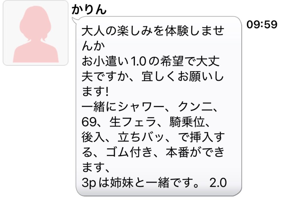 これは全部、業者で、しかも東南アジア系や中国、韓国といった国籍と見られるユーザーから「自宅でお願いします」的なメッセージが鬼のようにくるのよw