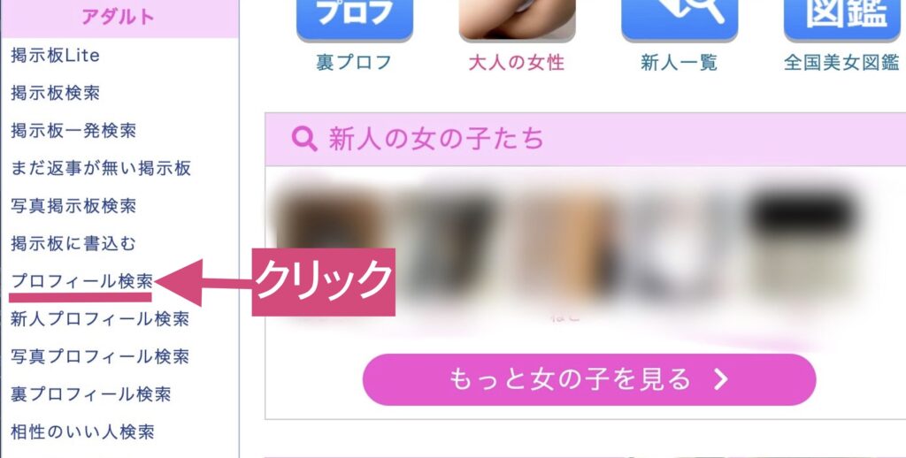 まずは【アダルト】→【プロフィール検索】をクリック〜!